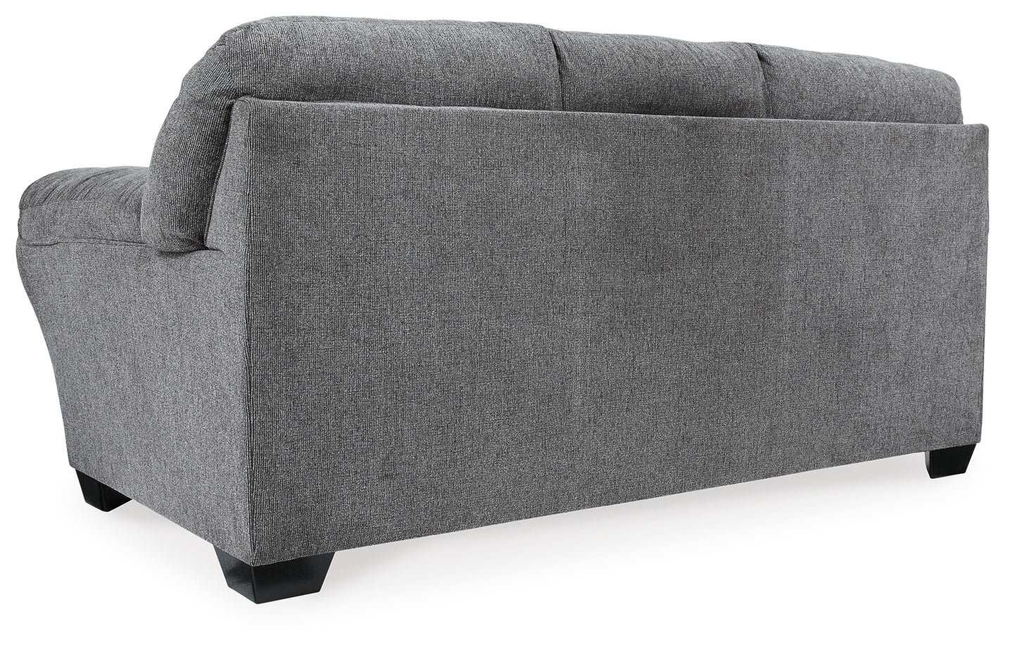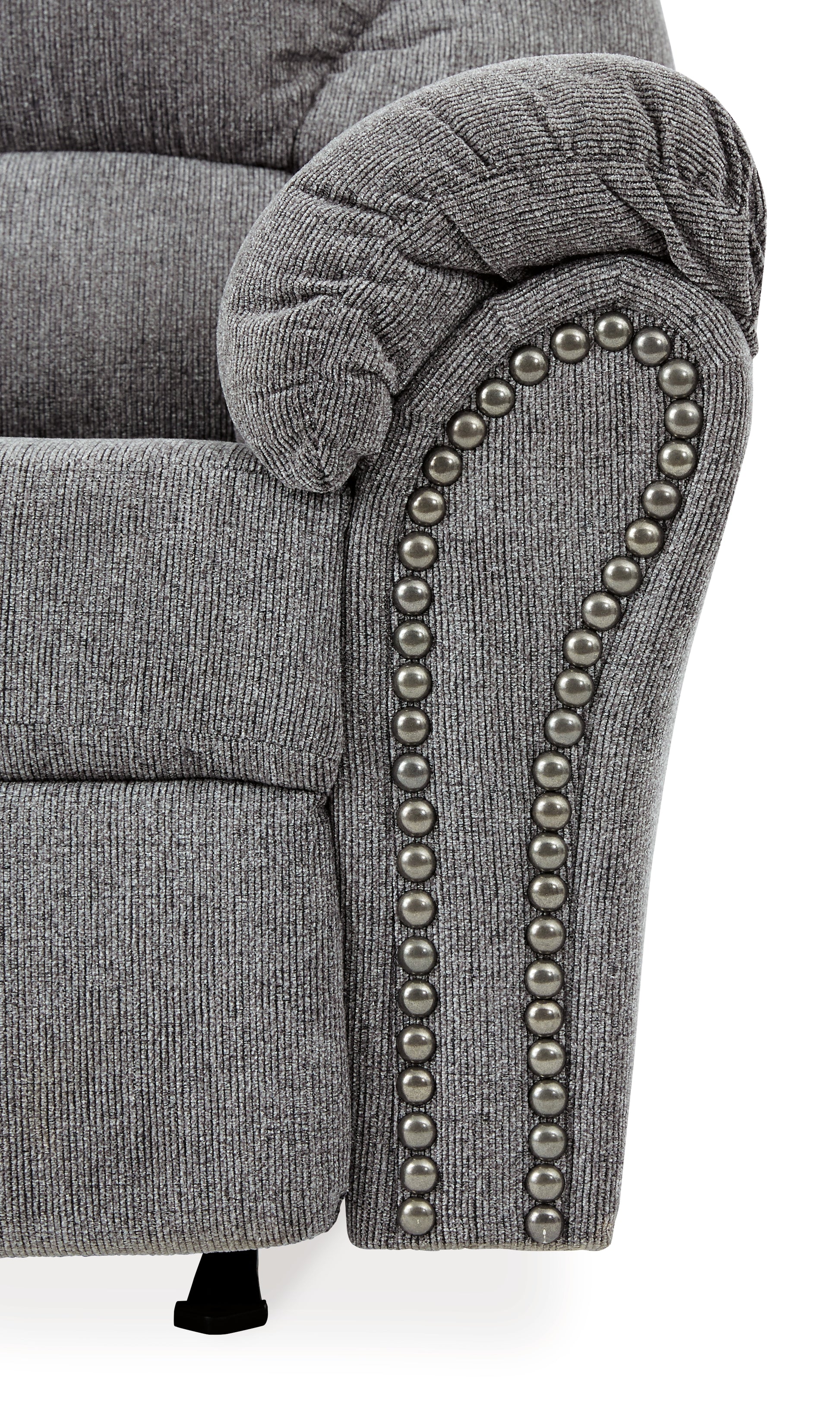 Why sacrifice comfort for style (or style for comfort) when you can have the best of both in this loveseat in pewter gray. Elements include a chic divided-back design and pillow top wrapped armrests that make nodding off all too easy. Calling attention to the elegantly flared armrests—black nickel-tone nailhead trim for a punch of cool character.