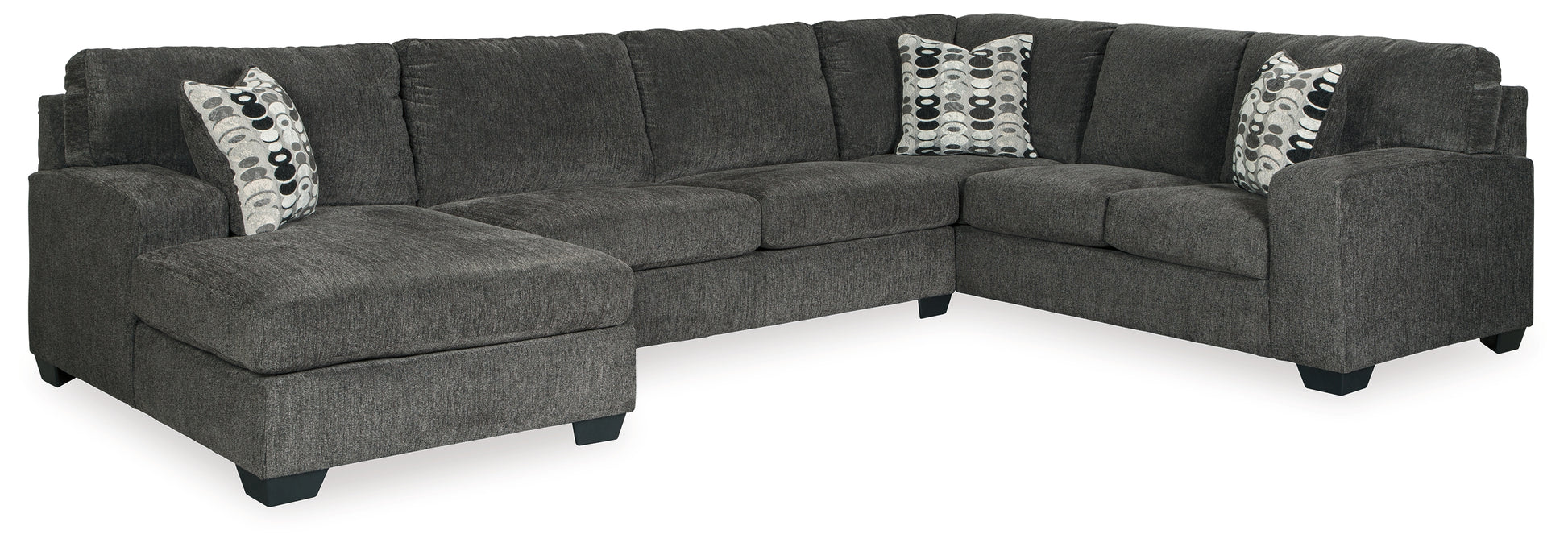 - Includes 3 pieces: left-arm facing corner chaise, armless loveseat and right-arm facing sofa