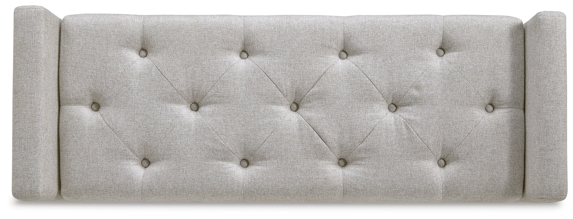Contemporary style gets practical with this bench. The tufted beige seat cushion is hinged to allow easy access to whatever you need to hide in plain sight. Raised edges give the impression of arms, while the light brown finished wood legs help it blend with many different modern styles.