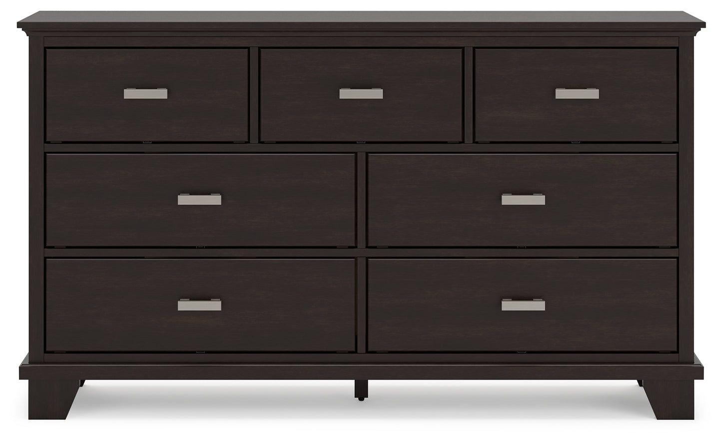 Feast your eyes on this richly versatile dresser with mirror. Its traditional-inspired dark brown finish effortlessly blends with contemporary bright nickel-tone pulls to create a stunning look that's not too stuffy or too trendy. Spacious drawers offer plenty of storage for your wardrobe and spare bed linens. The mirror is a handsome reflection of classic-meets-modern design.