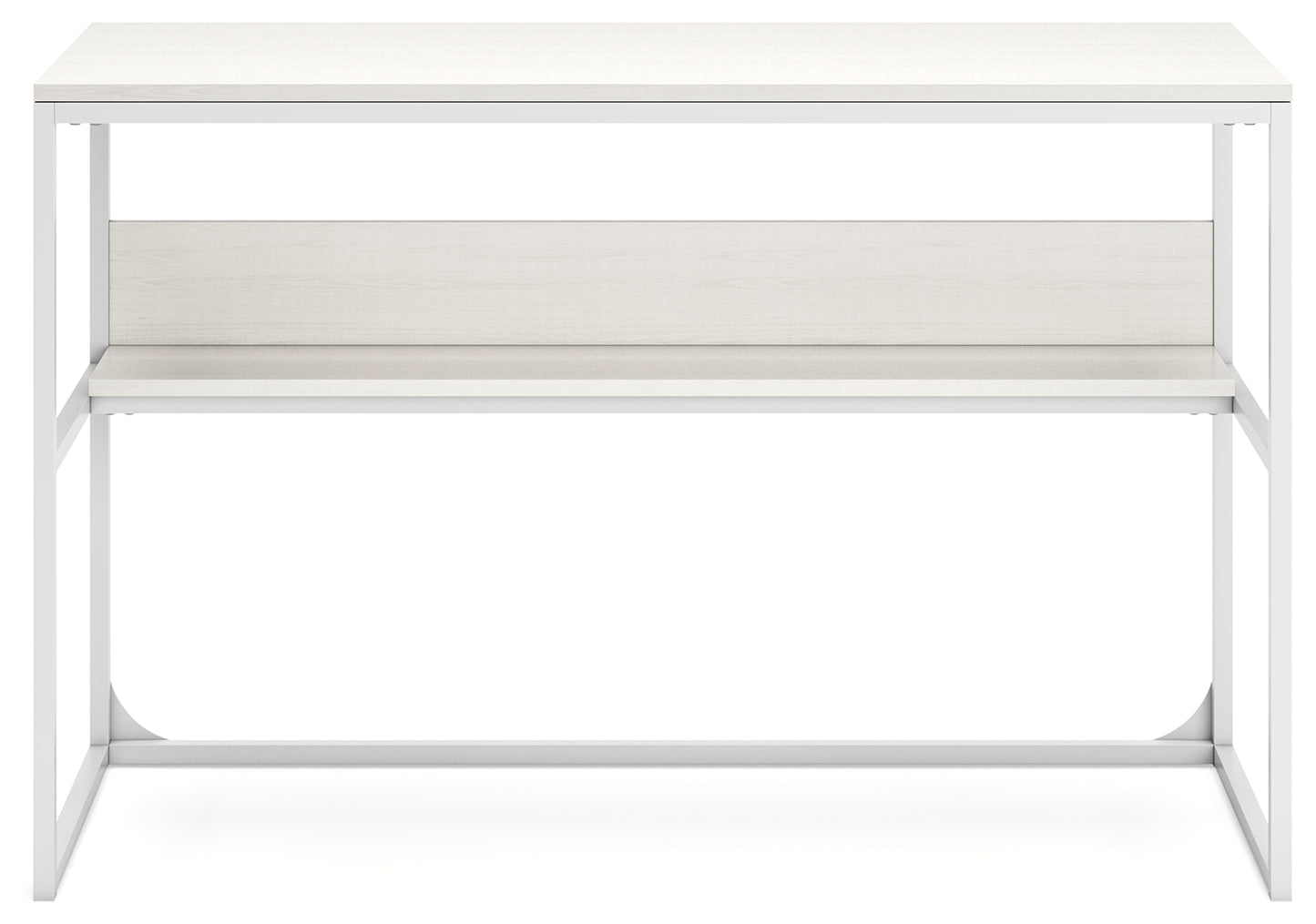 Bring your vision of a modern home workspace to life with this sleekly designed home office desk. Its linear construction and white finish keep things minimal. A small shelf along the back rounds out the versatile, striking desk.