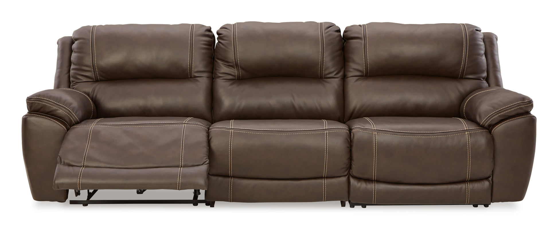 Load up on comfort in a cool, clean-lined and contemporary way with this power reclining sectional in chocolate brown. Rest assured, the expertly matched leather and faux leather upholstery is enriched with a pebble grain effect for authentic appeal and enhanced with jumbo stitching for dramatic contrast. It features a one-touch power control with adjustable positions, along with an Easy View™ adjustable headrest that allows a primo view of the TV even when you're reclined. Extended ottomans provide extra length for leg comfort. A zero-draw USB plug-in at your fingertips lets you charge up as you chill out.