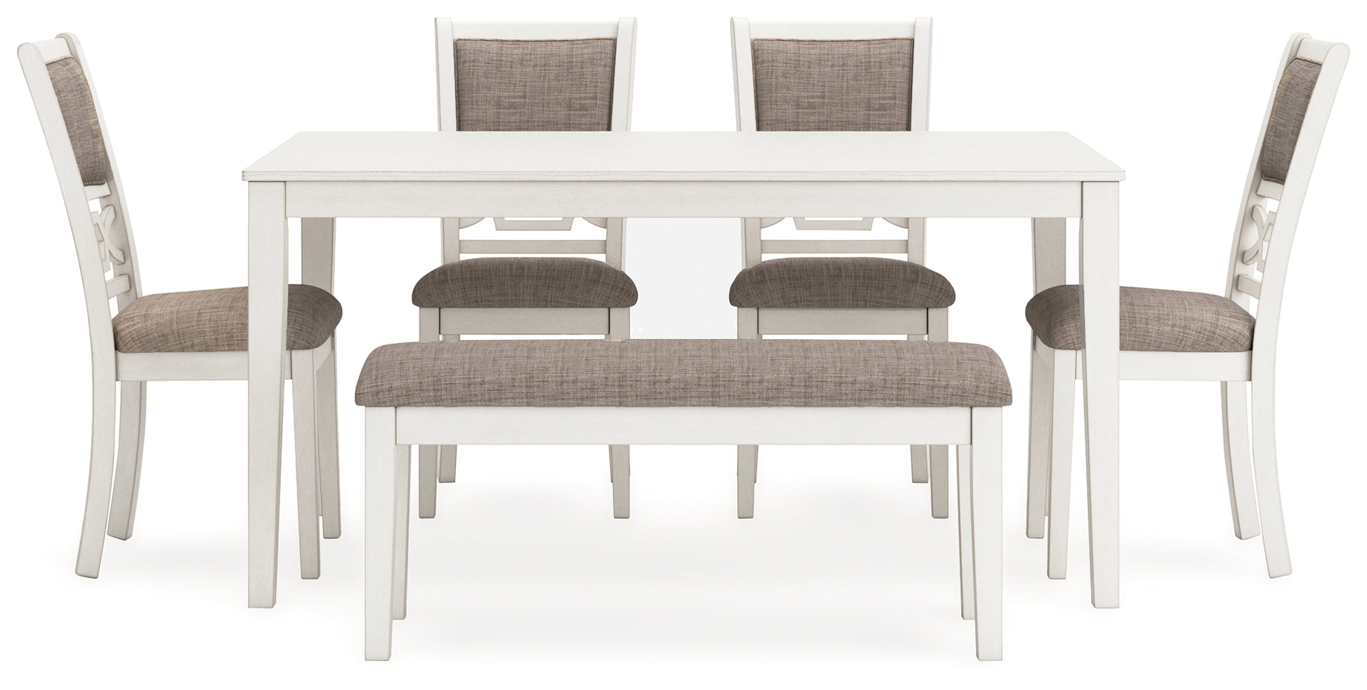 Come together for a delightful dining experience. Chic and relaxed, this dining set effortlessly captivates with its elegant simplicity. The timeless design of the table, chairs and bench pairs a crisp white hue with gray textured upholstery. It's a fresh addition everyone will notice.