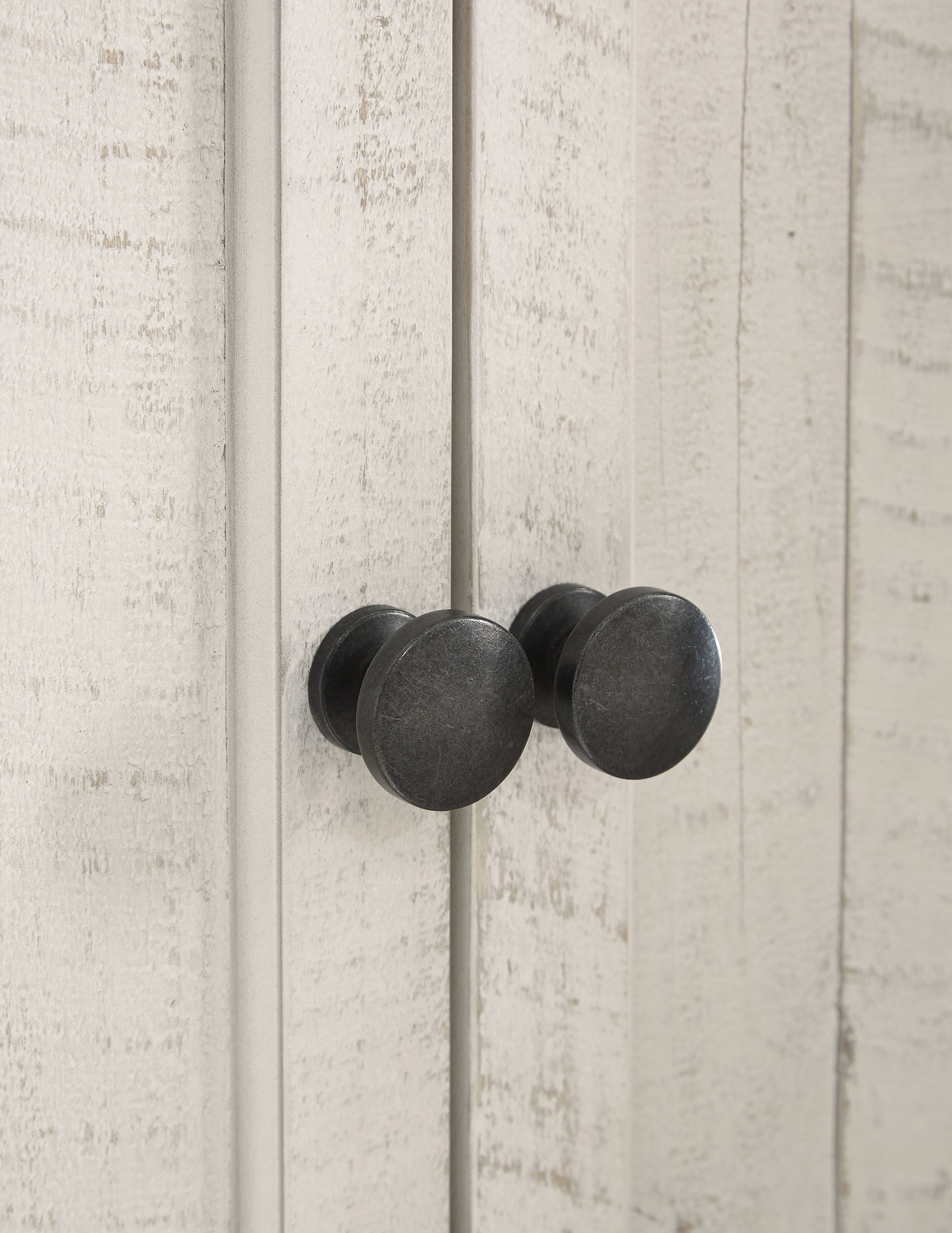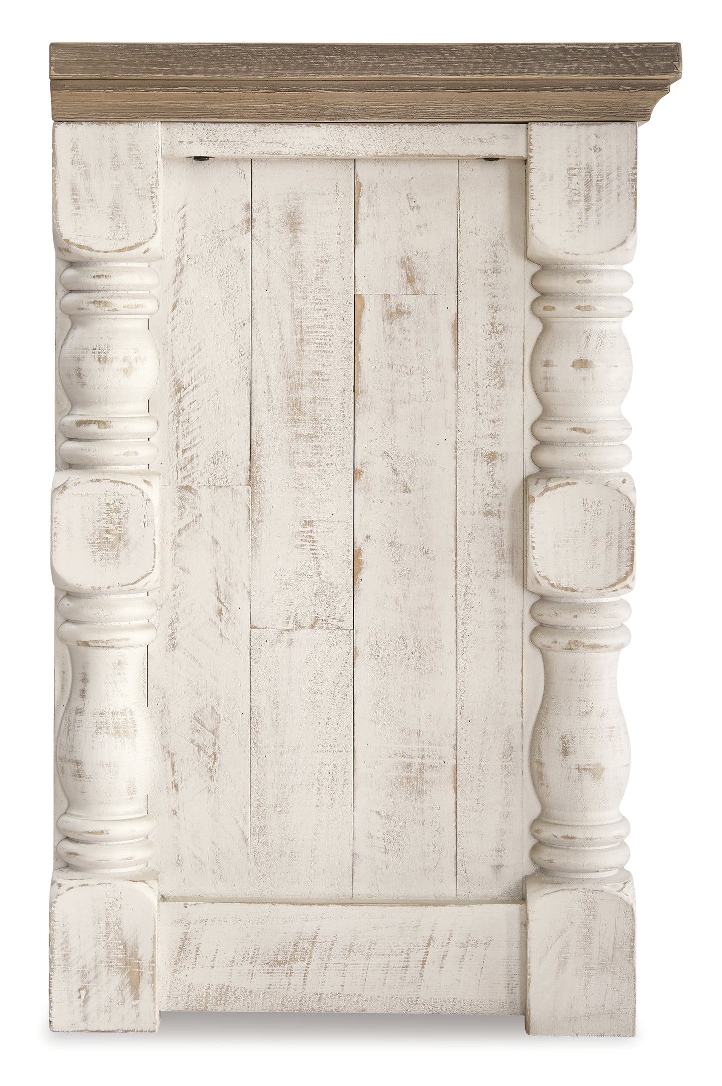 - Two-tone distressed finish: weathered gray top; vintage white base