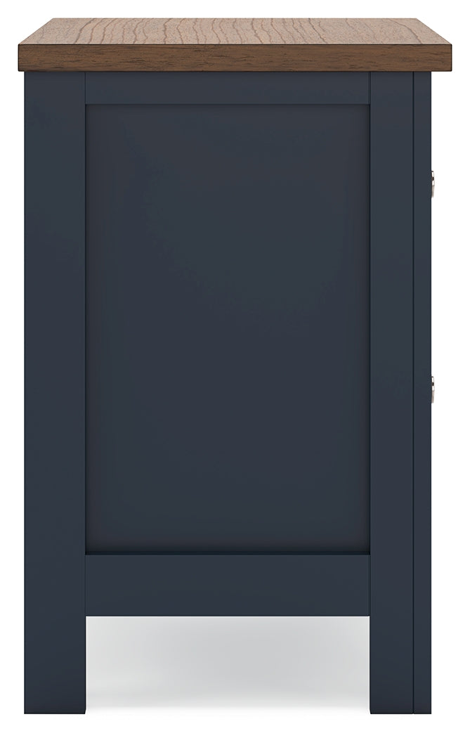 - Two-tone finish features a dark slate blue with a light brown wood-tone top