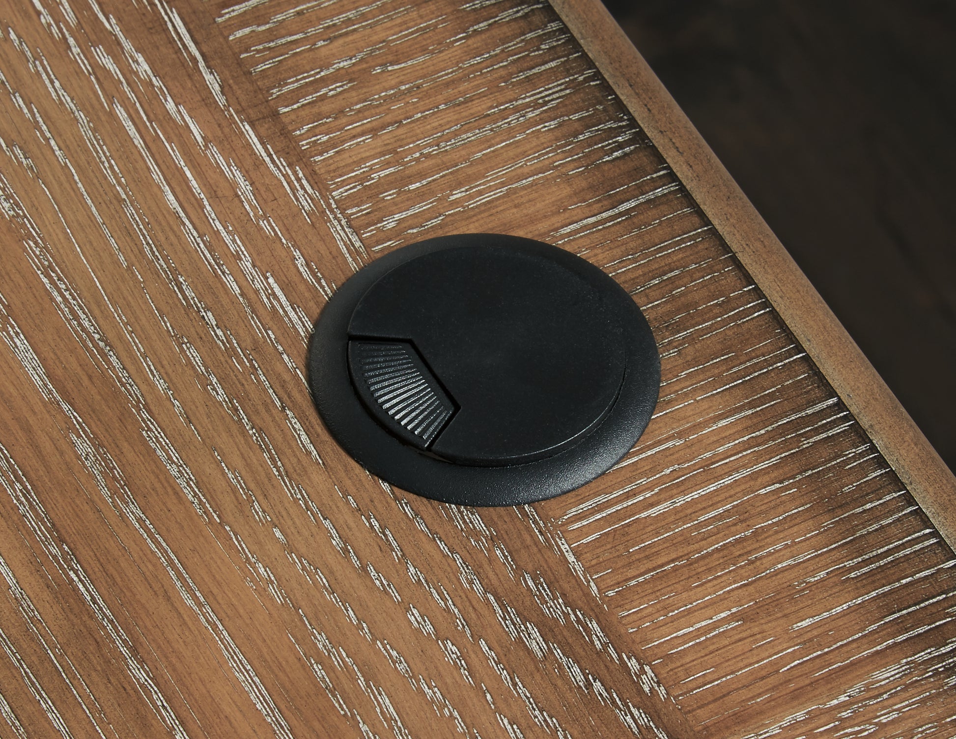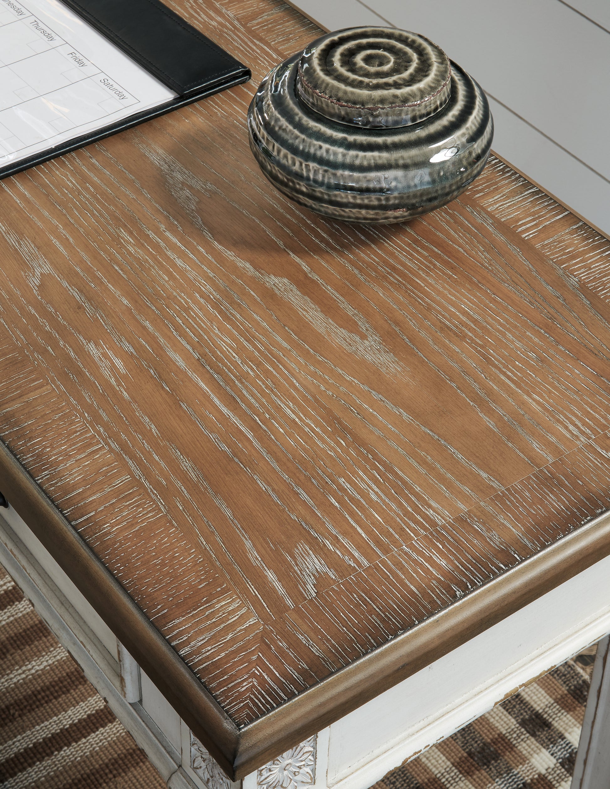 Elevating the art of traditional cottage styling, this L-shaped desk is your heavenly home office realized. Its two-tone finish combines chipped white with distressed wood tone tops for added charm. Framed drawer fronts, decorative corbels and elegantly turned and tapered legs add refinement, while dark bronze-tone knobs lend a classic touch.