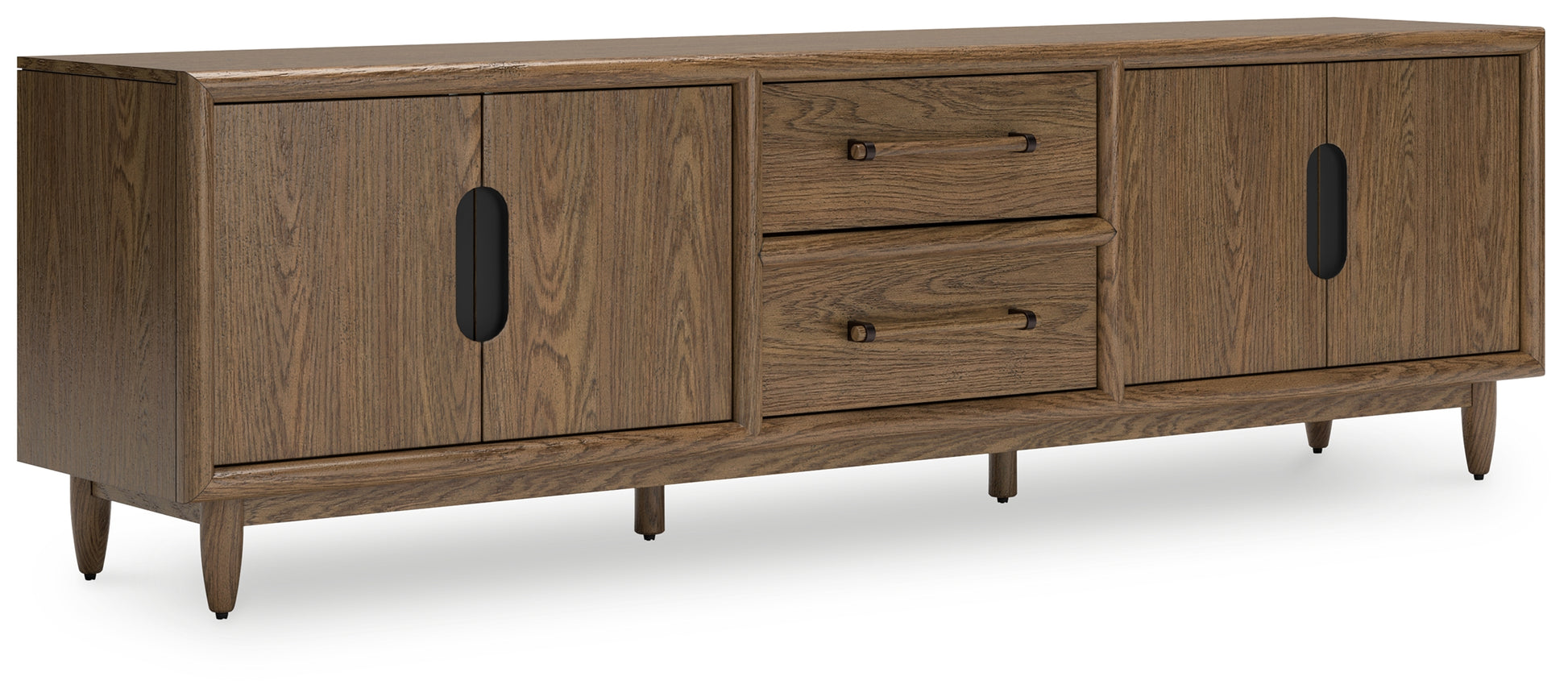 Introducing a TV stand inspired by the architectural language of mid-century expression. Its spacious cabinets and drawers provide ample storage, while a sleek design allows the natural beauty of the wood to shine through. Ready for a cinematic experience? This entertainment center is perfect for movie nights and relaxation.