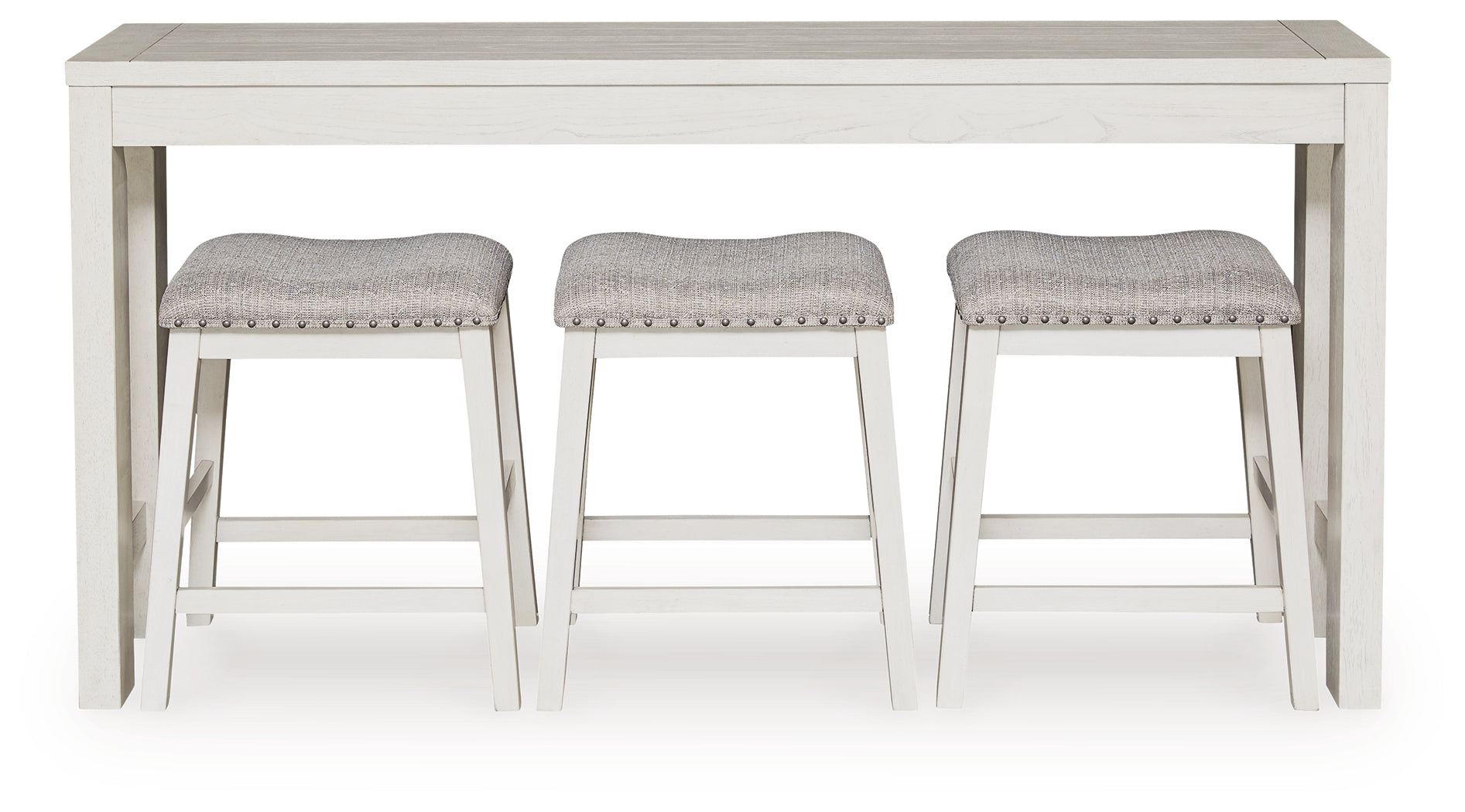 This counter height dining table and barstools set brings an air of casual charm to mealtime. With its antiqued white finish and light gray upholstered seats with nailhead trim, modern farmhouse-style dining has never been so fashionable. Plus the table includes handy USB charging and a power supply. All that’s missing is you and your family.