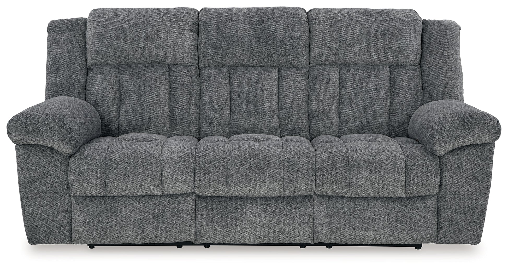 Big, bold comfort. Game time and movie nights meet their match with this power reclining sofa. Made for ultimate indulgence, an extra-deep seat encourages you to sit back and bliss out. Customize the recliner and headrest to find your ideal viewing position with effortless one-touch controls. And with plush upholstery in a trendy hue, you won’t need to sacrifice style for cozy seating.