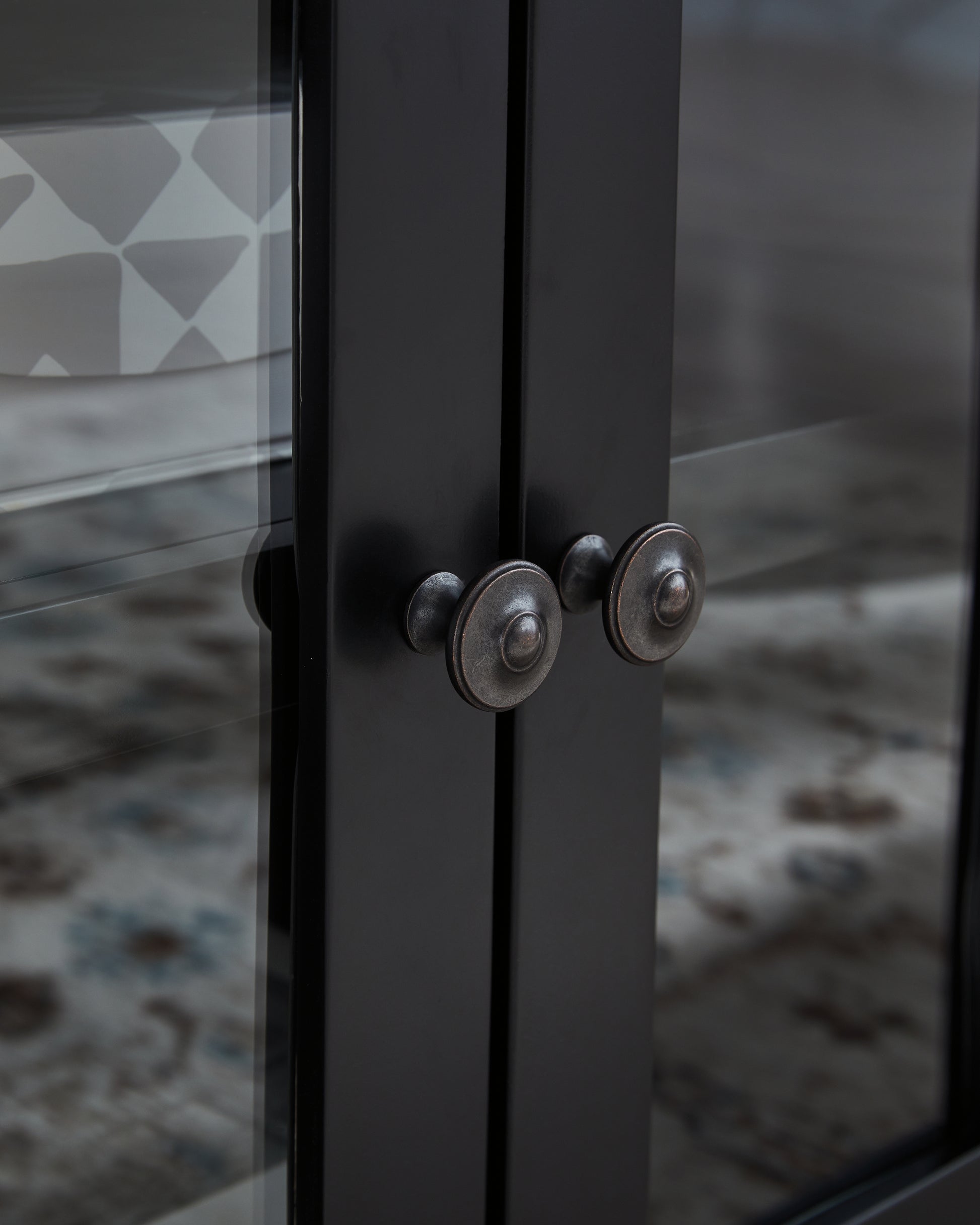 - Hardware with dark bronze-tone finish